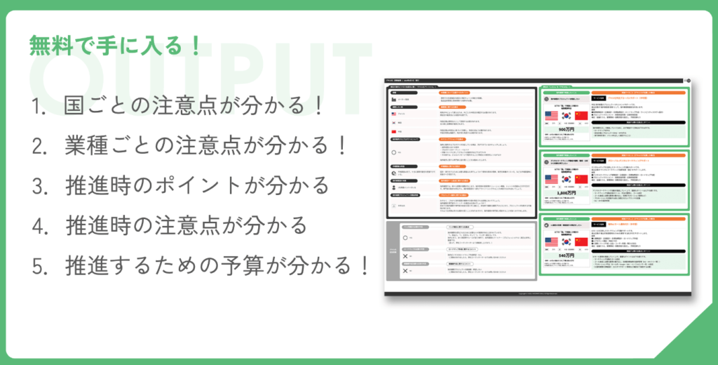 海外進出におけるポイント・国別の留意点・概算の進出にかかるコストの試算が可能です!